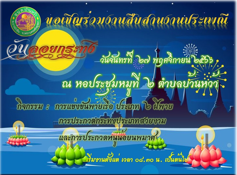 องค์การบริหารส่วนตำบลบ้านหว้า ขอเชิญร่วมงานลอยกระทง เที่ยวงานสืบสานประเพณีงานลอยกระทง ประจำปี 2566