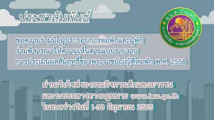 ชื่อเรื่อง : ประชาสัมพันธ์ขอความร่วมมือผู้ประกอบการหอพักและผู้พักร่วมพิจารณาให้ความเห็นตามแบบรายงานการประเมินผลสัมฤทธิ์ของพระราชบัญญัติหอพัก พ.ศ. 2558