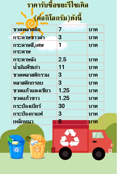 โดยจะมีการรับซื้อขยะรีไซเคิลทุกวันศุกร์สิ้นเดือน (วัน เวลา จะแจ้งให้ทราบอีกครั้ง)