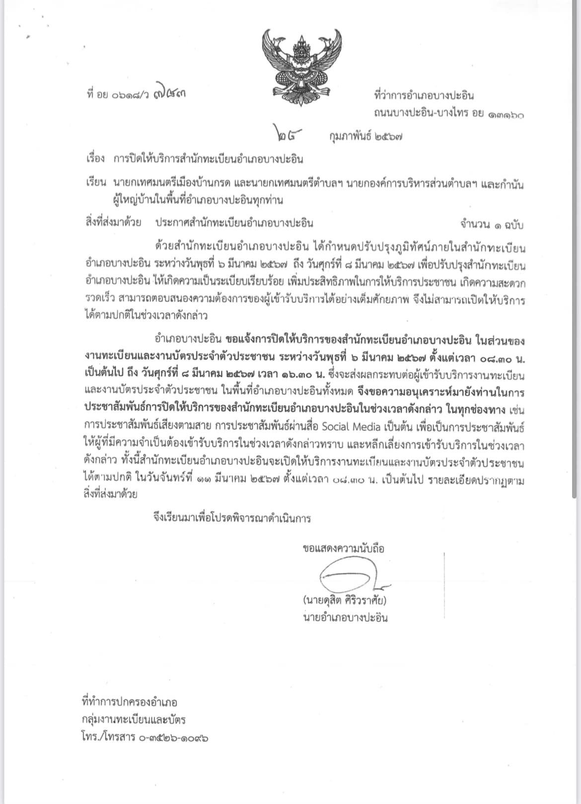 การปิดให้บริการสำนักทะเบียนอำเภอบางปะอิน