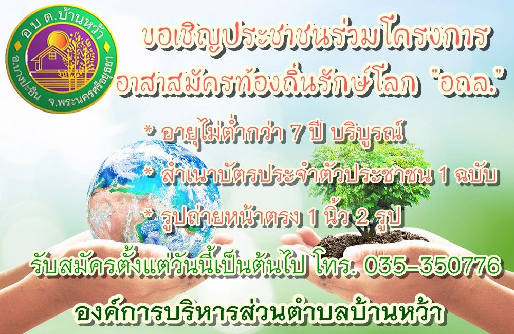 ชื่อเรื่อง : องค์การบริหารส่วนตำบลบ้านหว้าเปิดรับอาสาสมัครท้องถิ่นรักษ์โลก (อถล.)