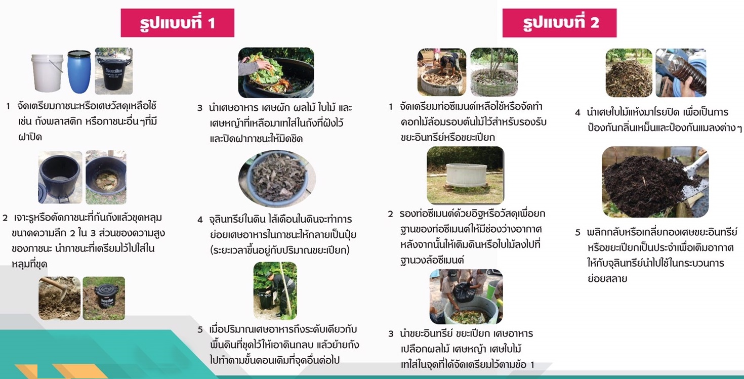 จากนั้นนำภาชนะที่เตรียมไว้มาเจาะรู หรือตัดก้นออก แล้วทำการขุดหลุมขนาดความลึก 2 ใน 3 ของความสูงภาชนะที่เตรียมไว้ จากนั้นก็นำภาชนะใส่ลงไปในหลุมที่ขุดไว้