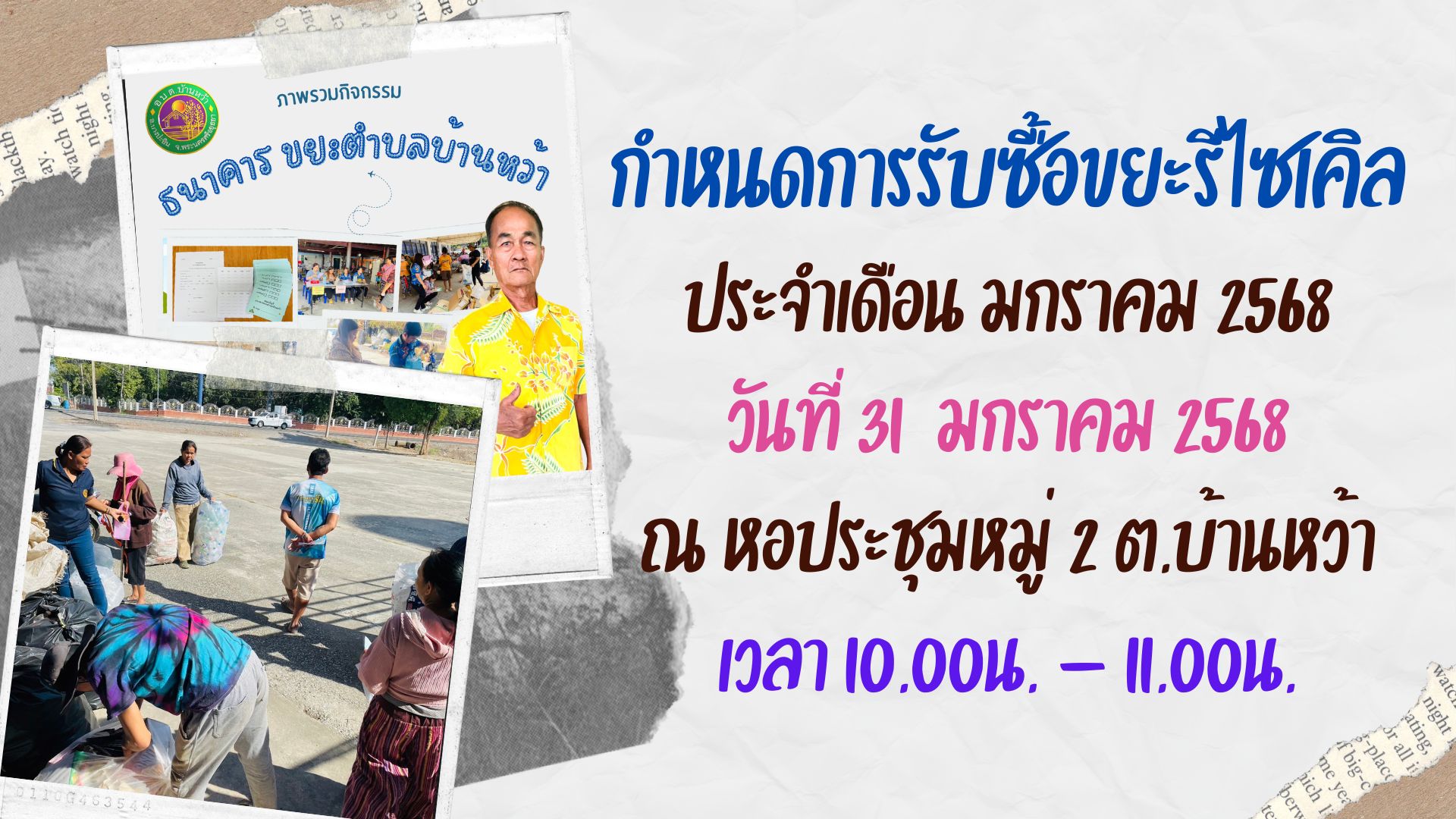 เชิญชวนประชาชนชาวตำบลบ้านหว้าและทุกท่านนำขยะรีไซเคิลมาขาย