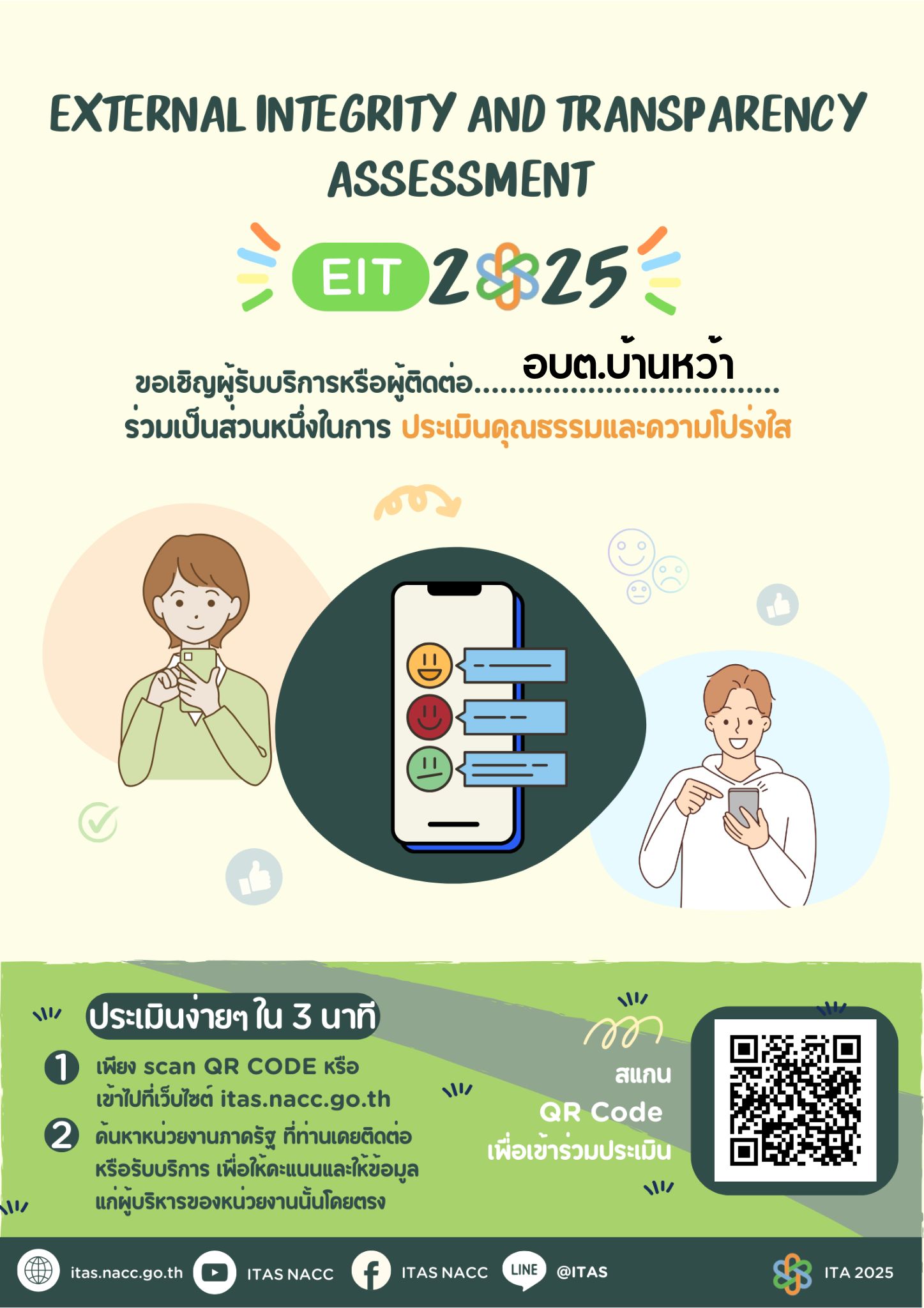 ชื่อเรื่อง : ขอเชิญผู้มีส่วนได้ส่วนเสียภายนอกองค์การบริหารส่วนตำบลบ้านหว้า ประเมิน ITA ปี 2568 ช่องทางการตอบแบบวัดการรับรู้ของผู้มีส่วนได้ส่วนเสียภายนอก (EIT)