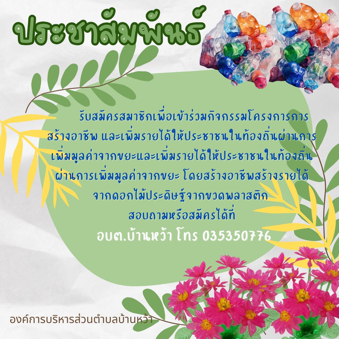 รายละเอียด : ประชาสัมพันธ์โครงการบริหารจัดการขยะอย่างยั่งยืน (ดอกไม้ประดิษฐ์จากขวดพลาสติก) องค์การบริหารส่วนตำบลบ้านหว้าได้กำหนดแนวทางการสร้างอาชีพ และเพิ่มรายได้ให้ประชาชนในท้องถิ่นผ่านการเพิ่มมูลค่าจากการคัดแยกขยะ (Upcycling Waste to Wealth) เพื่อเผยแพร่ให้องค์กรปกครองส่วนท้องถิ่นที่มีความสนใจสามารถศึกษาและใช้ประโยชน์เป็นแนวทางในการบริหารจัดการขยะในพื้นที่ให้มีประสิทธิภาพ สามารถลดปริมาณขยะ ที่จะไปสู่บ่อฝังกลบลดภาระขององค์กรปกครองส่วนท้องถิ่นในการจัดการปัญหาขยะ รักษาสิ่งแวดล้อมและลดการใช้ทรัพยากรธรรมชาติ และสามารถสร้างอาชีพและเพิ่มรายได้ให้กับประชาชนในท้องถิ่นได้อย่างยั่งยืน จึงขอเชิญชวนประชาชนตำบลบ้านหว้าสมัครสมาชิกเพื่อเข้าร่วมกิจกรรม/โครงการการสร้างอาชีพ และเพิ่มรายได้ให้ประชาชนในท้องถิ่นผ่านการเพิ่มมูลค่าจากขยะ โดยสร้างอาชีพสร้างรายได้จากดอกไม้ประดิษฐ์จากขวดพลาสติก สอบถามหรือสมัครได้ที่ อบต.บ้านหว้า โทร 035350776