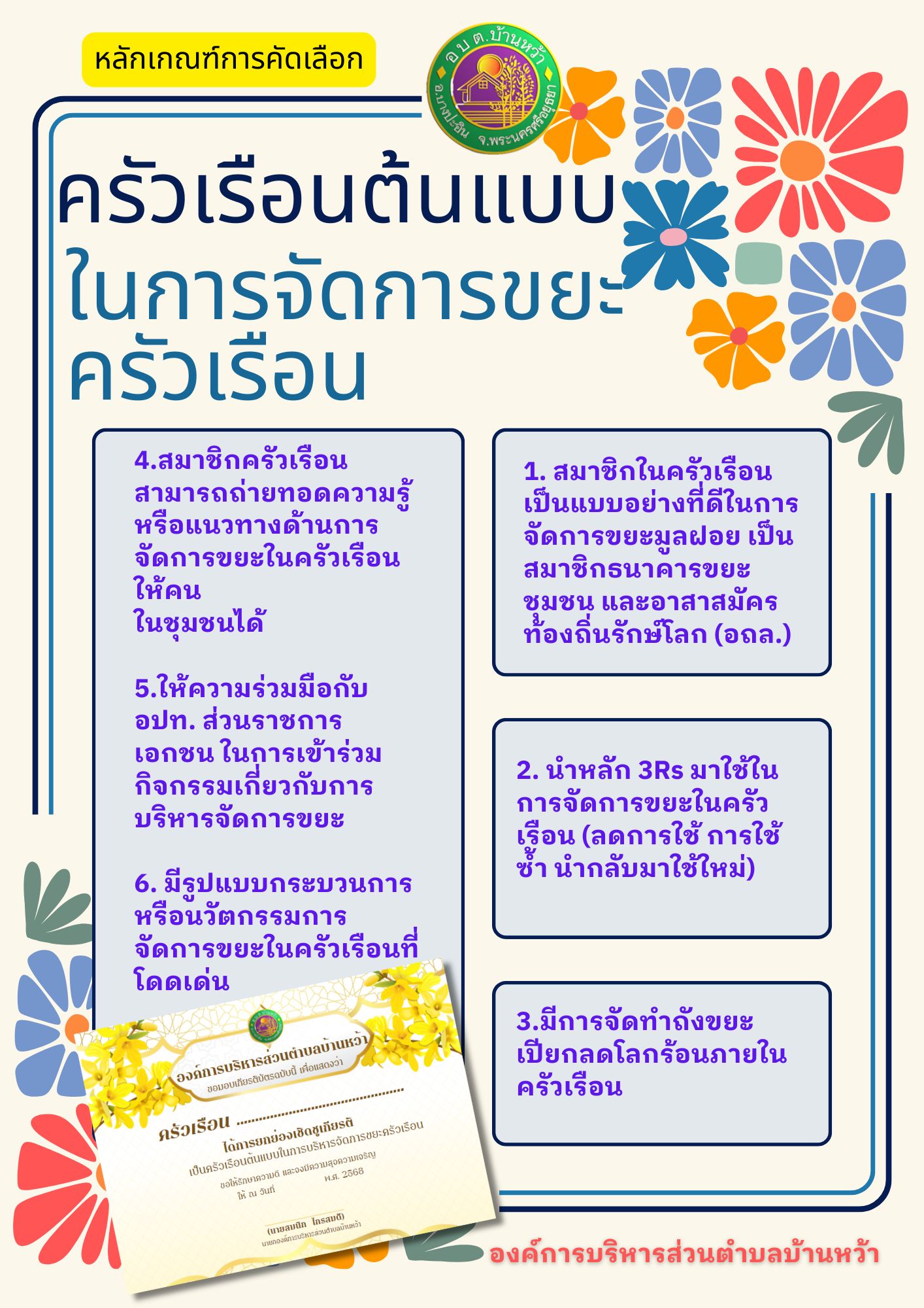 รายละเอียด : กำหนดแนวทางการคัดเลือก ดังนี้ 1. สมาชิกในครัวเรือนเป็นแบบอย่างที่ดีในการจัดการขยะมูลฝอย เป็นสมาชิกธนาคารขยะชุมชน และอาสาสมัครท้องถิ่นรักษ์โลก (อถล.) 2. นำหลัก 3Rs มาใช้ในการจัดการขยะในครัวเรือน (ลดการใช้ การใช้ซ้ำ นำกลับมาใช้ใหม่) 3. มีการคัดแยกขยะในครัวเรือน 4. มีการจัดทำถังขยะเปียกลดโลกร้อนภายในครัวเรือน 5. สมาชิกครัวเรือนสามารถถ่ายทอดความรู้หรือแนวทางด้านการจัดการขยะในครัวเรือนให้คน ในชุมชนได้ 6. ให้ความร่วมมือกับ อปท. ส่วนราชการ เอกชน ในการเข้าร่วมกิจกรรมเกี่ยวกับการบริหารจัดการขยะ 7. มีรูปแบบกระบวนการหรือนวัตกรรมการจัดการขยะในครัวเรือนที่โดดเด่น 8. มีการจัดการขยะในครัวเรือนอย่างต่อเนื่องและมีวิถีชีวิตที่เป็นมิตรกับสิ่งแวดล้อม