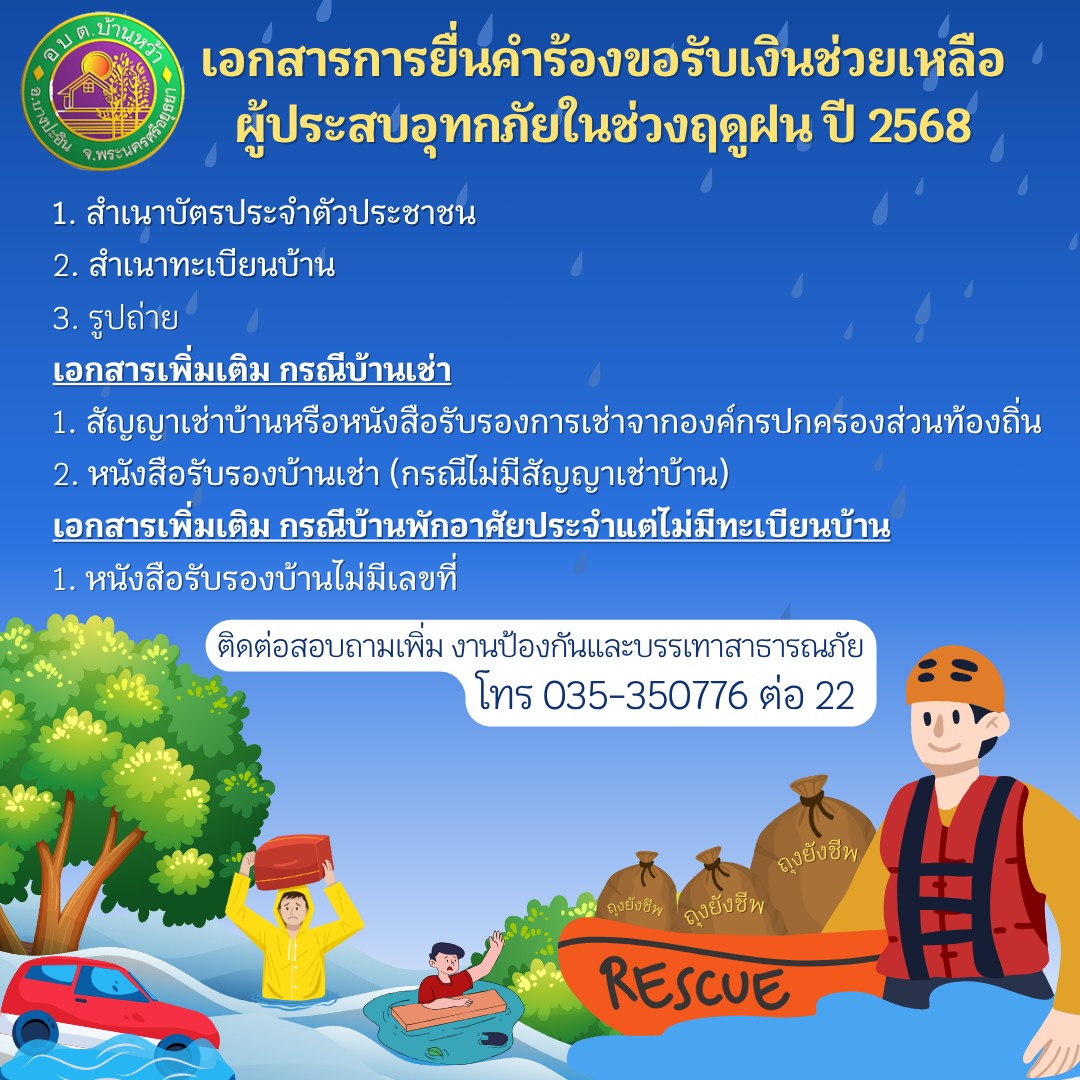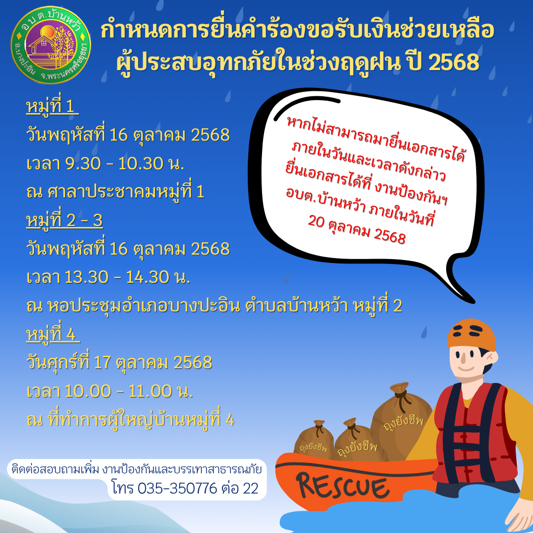 ขอแจ้งนัดหมายการยื่นเอกสารการช่วยเหลือผู้ประสบอุทกภัยในช่วงฤดูฝน ปี 2568