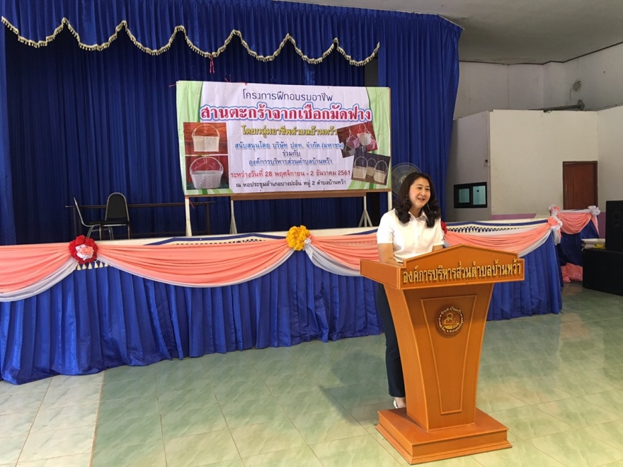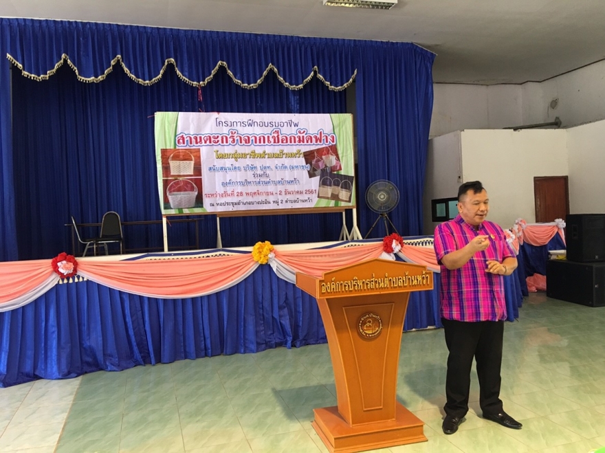 รายละเอียด : ในวันที่ 28 พฤศจิกายน 2561 พ.อ.อ. พิษณุ สุขีลักษณ์ ปลัดองค์การบริหารส่วนตำบลบ้านหว้า ร่วมกับบริษัท ปตท. จำกัด (มหาชน) เปิดงานโครงการฝึกอบรมอาชีพ ให้แก่กลุ่มอาชีพตำบลบ้านหว้า "สานตระกร้าด้วยเชือกมัดฟาง" ณ หอประชุม หมู่ที่ 2 ตำบลบ้านหว้า