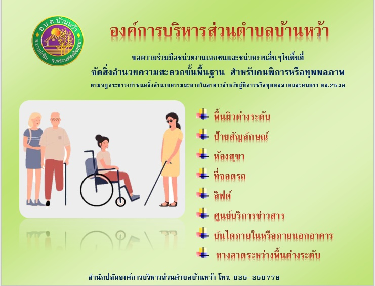 รายละเอียด : องค์การบริหารส่วนตำบลบ้านหว้า ขอความร่วมมือองค์กร และสถานประกอบการต่างๆ ในเขตตำบลบ้านหว้าจัดทำสิ่งอำนวยความสะดวกขั้นพื้นฐานสำหรับคนพิการ 5 ประเภท ได้แก่ ทางลาด ห้องน้ำ ที่จอดรถ ป้ายหรือสัญลักษณ์ และบริการข้อมูลสำหรับคนพิการ เพื่อสนับสนุนและส่งเสริมการสร้างสภาพแวดล้อมทางกายภาพให้เหมาะสมสำหรับคนพิการ เพื่อให้คนพิการสามารถเข้าถึงบริการได้ด้วยตนเอง ลดการพึ่งพา ดำรงตนได้อน่างมีความสุข