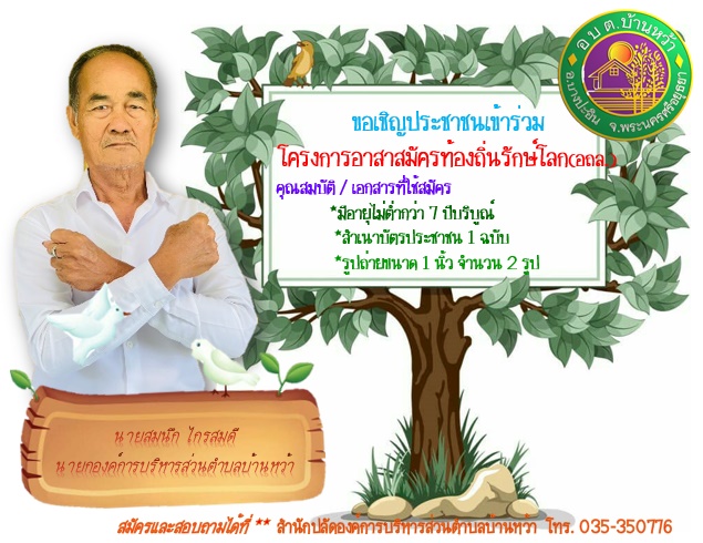 ชื่อเรื่อง : องค์การบริหารส่วนตำบลบ้านหว้าเปิดรับอาสาสมัครท้องถิ่นรักษ์โลก (อถล.)