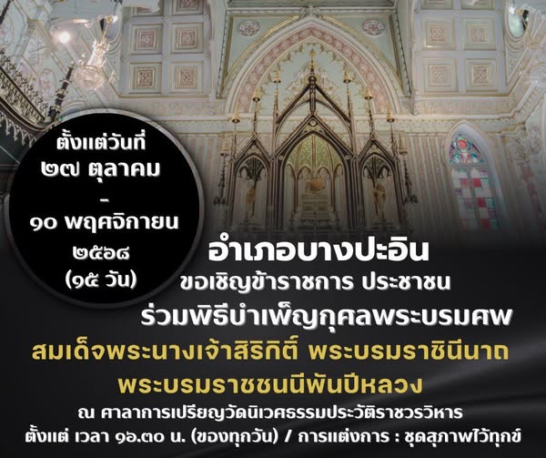 ชื่อเรื่อง : อำเภอบางปะอิน ขอเชิญชวนข้าราชการ ประชาชน ร่วมพิธีบำเพ็ญกุศลพระบรมศพ สมเด็จพระนางเจ้าสิริกิติ์ พระบรมราชินีนาถ พระบรมราชชนนีพันปีหลวง