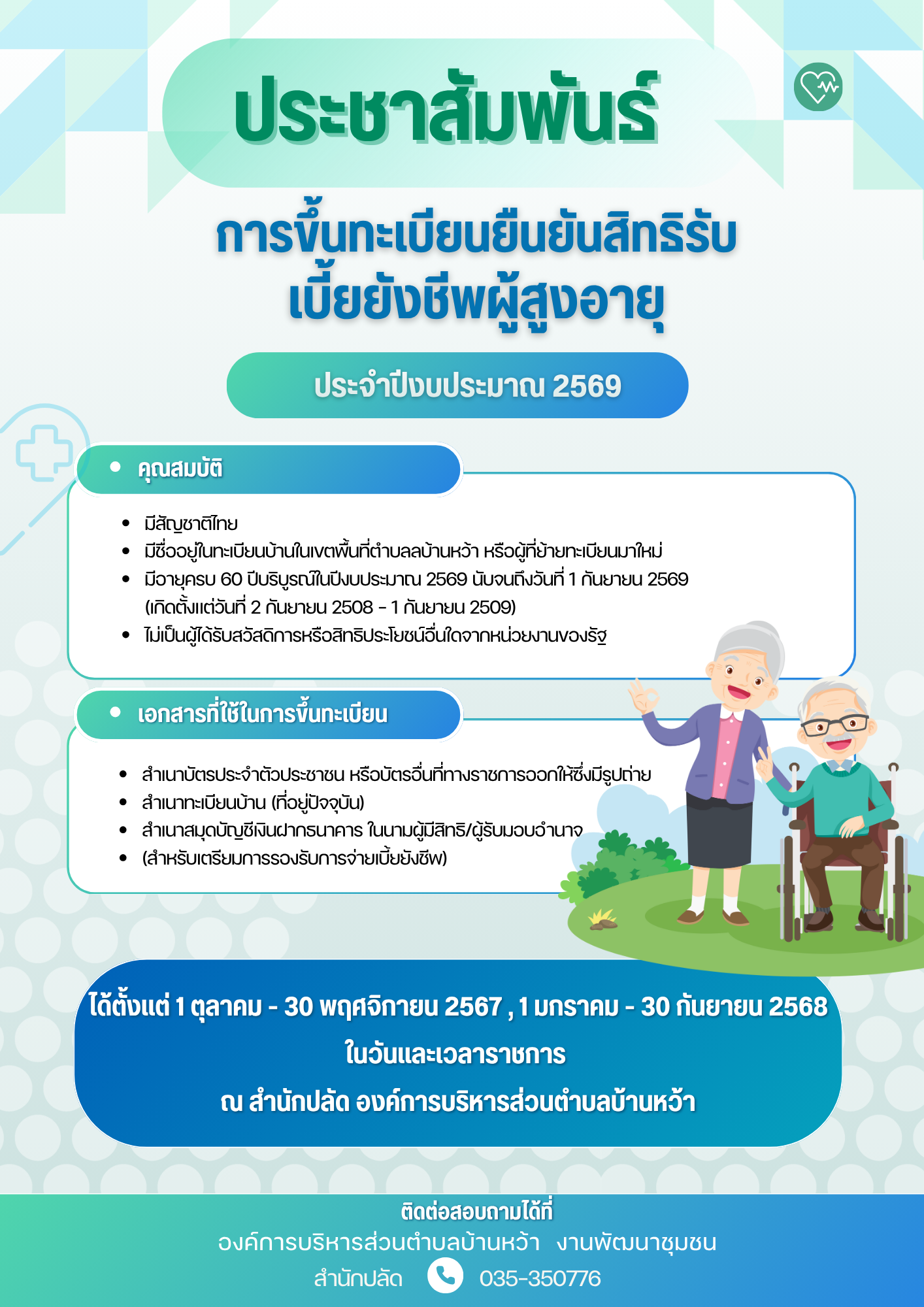 ประชาสัมพันธ์ การขึ้นทะเบียนยืนยันสิทธิรับเบี้ยยังชีพผู้สูงอายุ 2569