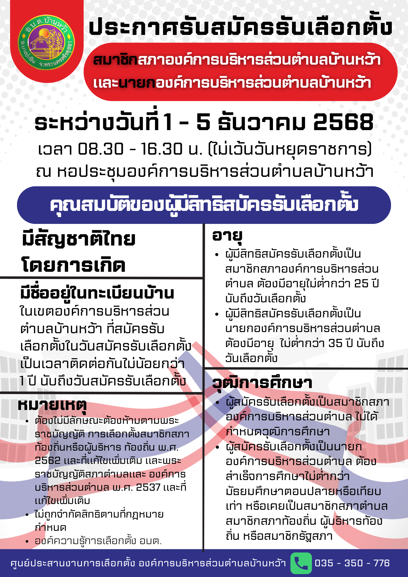 รายละเอียด : ประกาศรับสมัครเลือกตั้ง สมาชิกสภาองค์การบริหารส่วนตำบลและนายกองค์การบริหารส่วนตำบลบ้านหว้า
