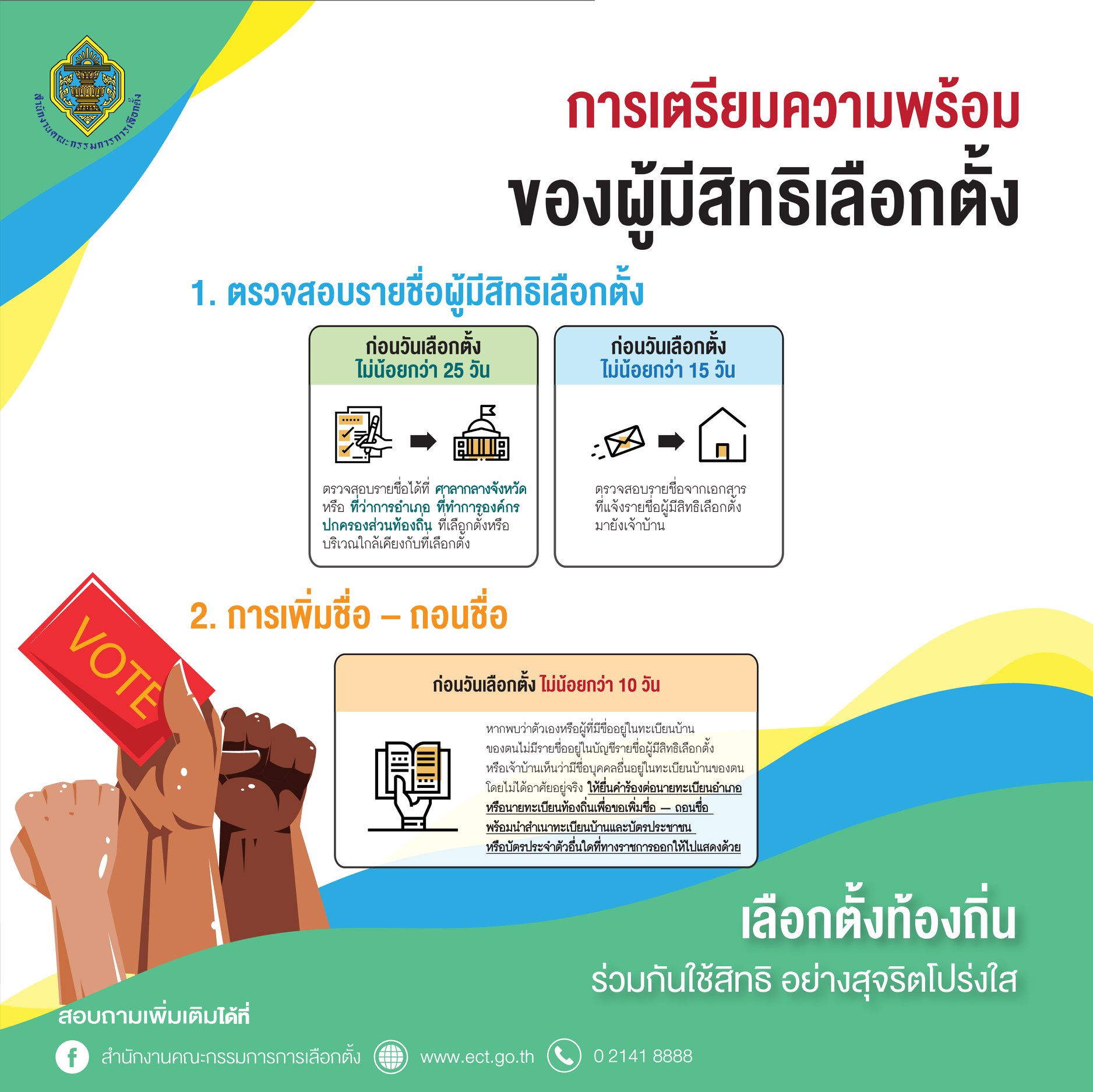 รายละเอียด : การเตรียมความพร้อมของผู้มีสิทธิเลือกตั้ง ในการเลือกตั้งสมาชิกสภาองค์การบริหารส่วนตำบลและนายกองค์การบริหารส่วนตำบล ผู้มีสิทธิเลือกตั้งต้องดำเนินการเตรียมพร้อมก่อนไปใช้สิทธิ ดังนี้ 1. ตรวจสอบรายชื่อผู้มีสิทธิเลือกตั้ง ก่อนวันเลือกตั้งไม่น้อยกว่า 25 วัน ตรวจสอบรายชื่อได้ที่ศาลากลางจังหวัด หรือที่ว่าการอำเภอ องค์การบริหารส่วนตำบล ที่เลือกตั้งหรือบริเวณใกล้เคียงกับที่เลือกตั้ง ก่อนวันเลือกตั้งไม่น้อยกว่า 15 วัน ตรวจสอบรายชื่อจากเอกสารที่แจ้งรายชื่อผู้มีสิทธิเลือกตั้งมายังเจ้าบ้าน 2. การเพิ่มชื่อ – ถอนชื่อ ก่อนวันเลือกตั้งไม่น้อยกว่า 10 วัน หากพบว่าตนเองหรือผู้มีชื่อยู่ในทะเบียนบ้านของตนไม่มีรายชื่ออยู่ในบัญชีรายชื่อผู้มีสิทธิเลือกตั้ง หรือเจ้าบ้านเห็นว่ามีชื่อบุคคลอื่นอยู่ในทะเบียนบ้านของตนโดยไม่ได้อาศัยอยู่จริงให้ยื่นคำร้องต่อนายทะเบียนอำเภอหรือนายทะเบียนท้องถิ่นเพื่อขอเพิ่มชื่อ – ถอนชื่อ พร้อมนำสำเนาทะเบียนบ้านและบัตรประชาชนหรือบัตรประจำตัวอื่นใดที่ทางราชการออกให้ไปแสดงด้วย การแจ้งเหตุที่ไม่อาจไปใช้สิทธิเลือกตั้งได้ ผู้มีสิทธิเลือกตั้งใดที่ไม่อาจไปใช้สิทธิเลือกตั้งได้ เนื่องจากมีเหตุอันสมควร ให้แจ้งเหตุที่ไม่อาจไปใช้สิทธิเลือกตั้งต่อนายทะเบียนอำเภอที่ตนมีชื่ออยู่ในทะเบียนบ้าน โดยทำเป็นหนังสือซึ่งต้องระบุเลขประจำตัวประชาชน และที่อยู่ตามหลักฐานทะเบียนบ้าน ภายใน 7 วันก่อนวันเลือกตั้ง หรือภายใน 7 วันนับแต่วันเลือกตั้ง สามารถแจ้งด้วยตัวเอง หรือมอบหมายให้ผู้อื่นไปยื่นแทน หรือจัดส่งทางไปรษณีย์ลงทะเบียน เหตุจำเป็นที่ไม่อาจไปใช้สิทธิเลือกตั้งได้ - มีกิจธุระจำเป็นเร่งด่วนที่ต้องเดินทางไปพื้นที่ห่างไกล - เจ็บป่วยและไม่สามารถเดินทางไปใช้สิทธิเลือกตั้งได้ - เป็นคนพิการหรือทุพพลภาพ หรือผู้สูงอายุและไม่สามารถเดินทางไปใช้สิทธิเลือกตั้งได้ - เดินทางออกนอกราชอาณาจักร - มีถิ่นที่อยู่ห่างไกลจากที่เลือกตั้งเกินกว่า 100 กิโลเมตร - ได้รับคำสั่งจากทางราชการให้ไปปฏิบัติหน้าที่นอกเขตเลือกตั้ง - มีเหตุสุดวิสัยหรือเหตุอื่นที่ กกต. กำหนด กรณีที่ผู้มีสิทธิเลือกตั้งได้แจ้งเหตุไว้แล้ว หากในวันเลือกตั้งเหตุดังกล่าวได้สิ้นสุดลง ผู้มีสิทธิเลือกตั้งสามารถไปใช้สิทธิเลือกตั้งที่หน่วยเลือกตั้งที่ตนมีสิทธิเลือกตั้งได้ หากไม่ไปใช้สิทธิเลือกตั้งจะถูกจำกัดสิทธิ ดังนี้ สมัครรับเลือกตั้งเป็น สส. หรือ สถ. หรือ ผถ. หรือสมัครรับเลือกเป็น สว. สมัครรับเลือกเป็นกำนันและผู้ใหญ