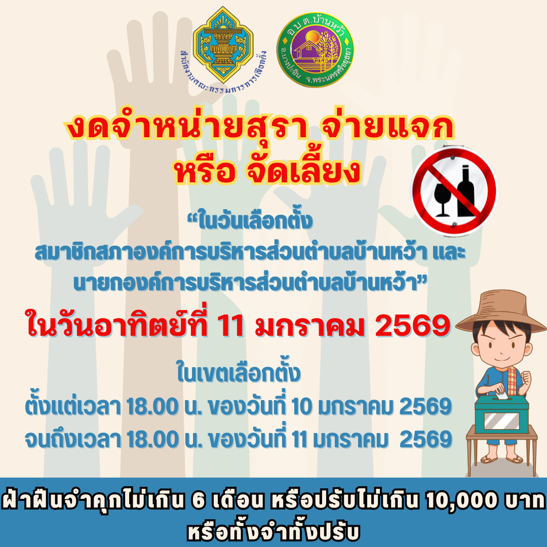 ชื่อเรื่อง : ก่อนวันเลือกตั้งและวันเลือกตั้ง ห้ามขาย ห้ามจำหน่าย ห้ามจ่ายแจก หรือจัดเลี้ยงสุราทุกชนิดในเขตเลือกตั้ง