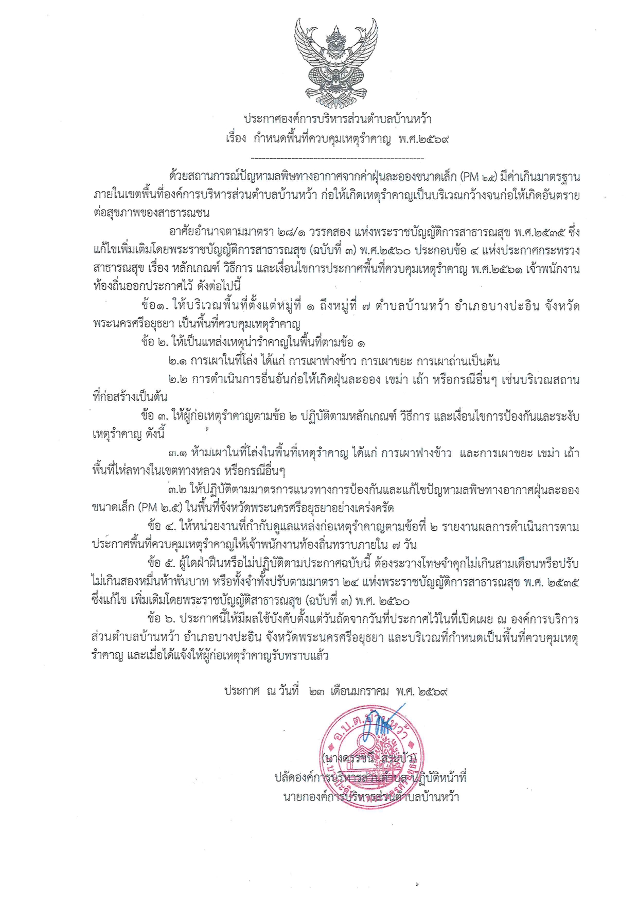 ประกาศองค์การบริหารส่วนตำบลบ้านหว้า เรื่อง กำหนดพื้นที่ควบคุมเหตุรำคาญ พ.ศ.2569